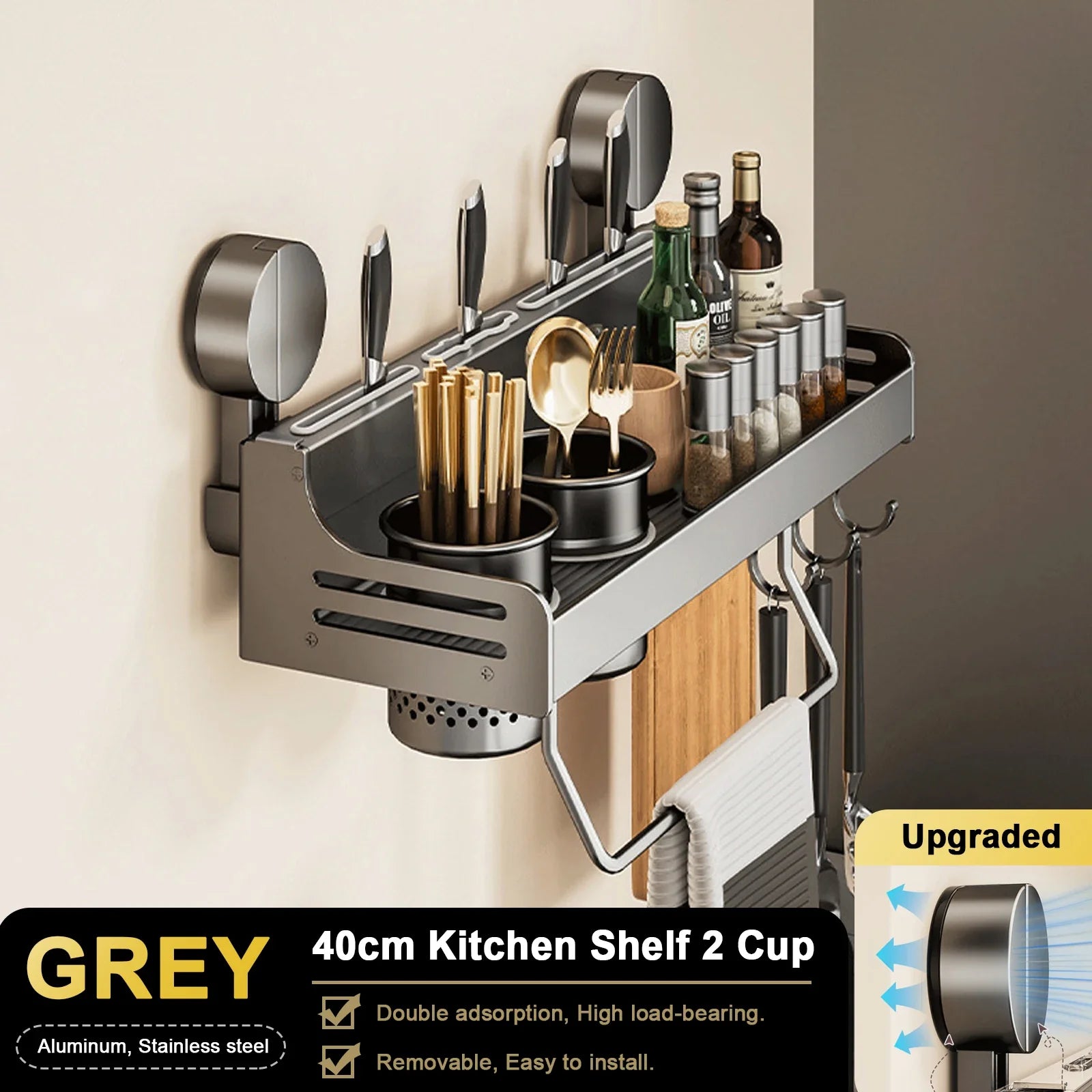 Nowoczesna półka kuchenna montowana bez wiercenia. Dzięki mocnym przyssawkom można ją łatwo zamocować na ścianie lub płytkach, tworząc dodatkową przestrzeń na przyprawy, noże, łyżki czy pałeczki.