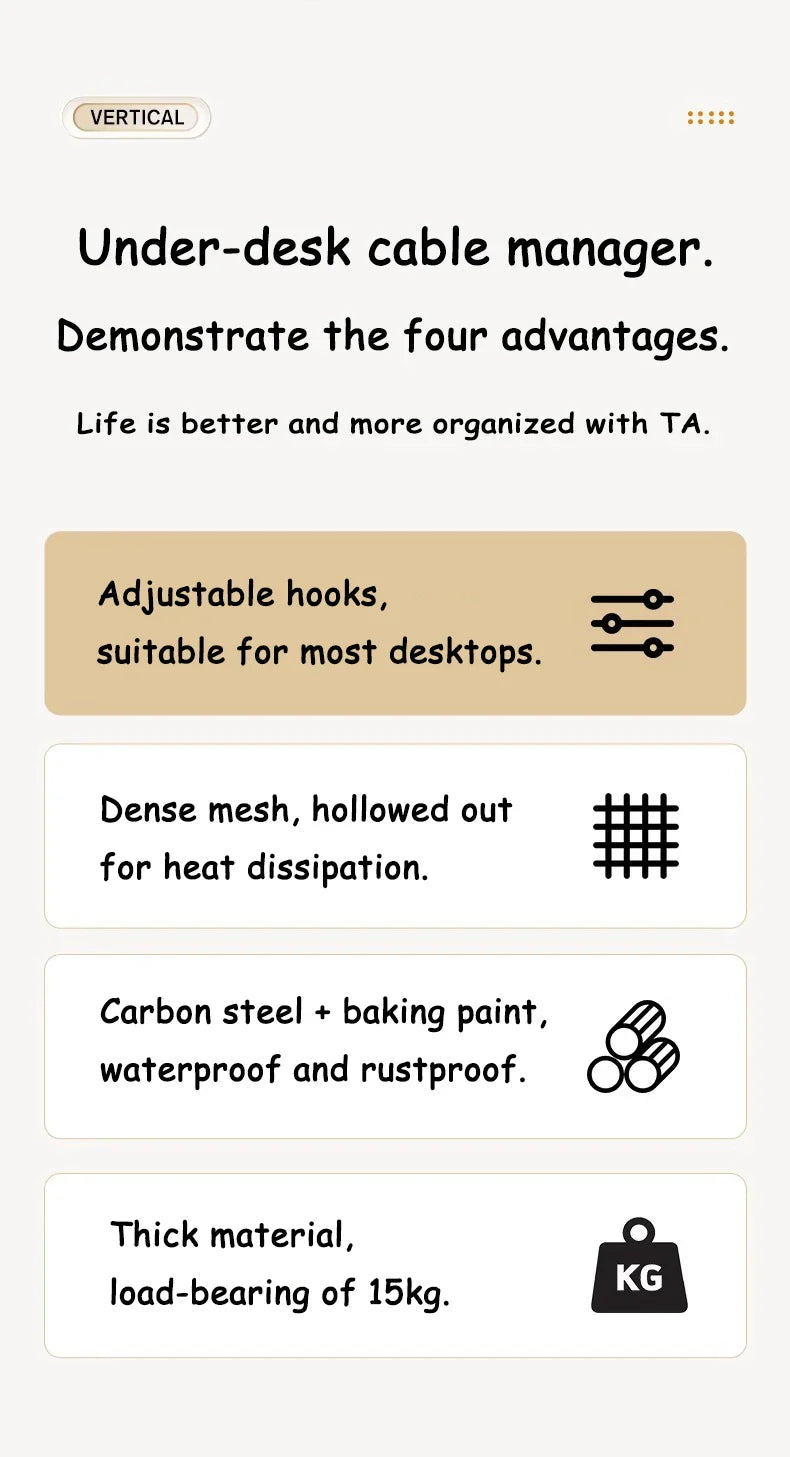 Metalowa półka montowana pod blatem biurka do organizacji kabli, listwy zasilającej i akcesoriów. Pomaga utrzymać porządek w domowym biurze lub salonie, eliminując plątaninę przewodów.